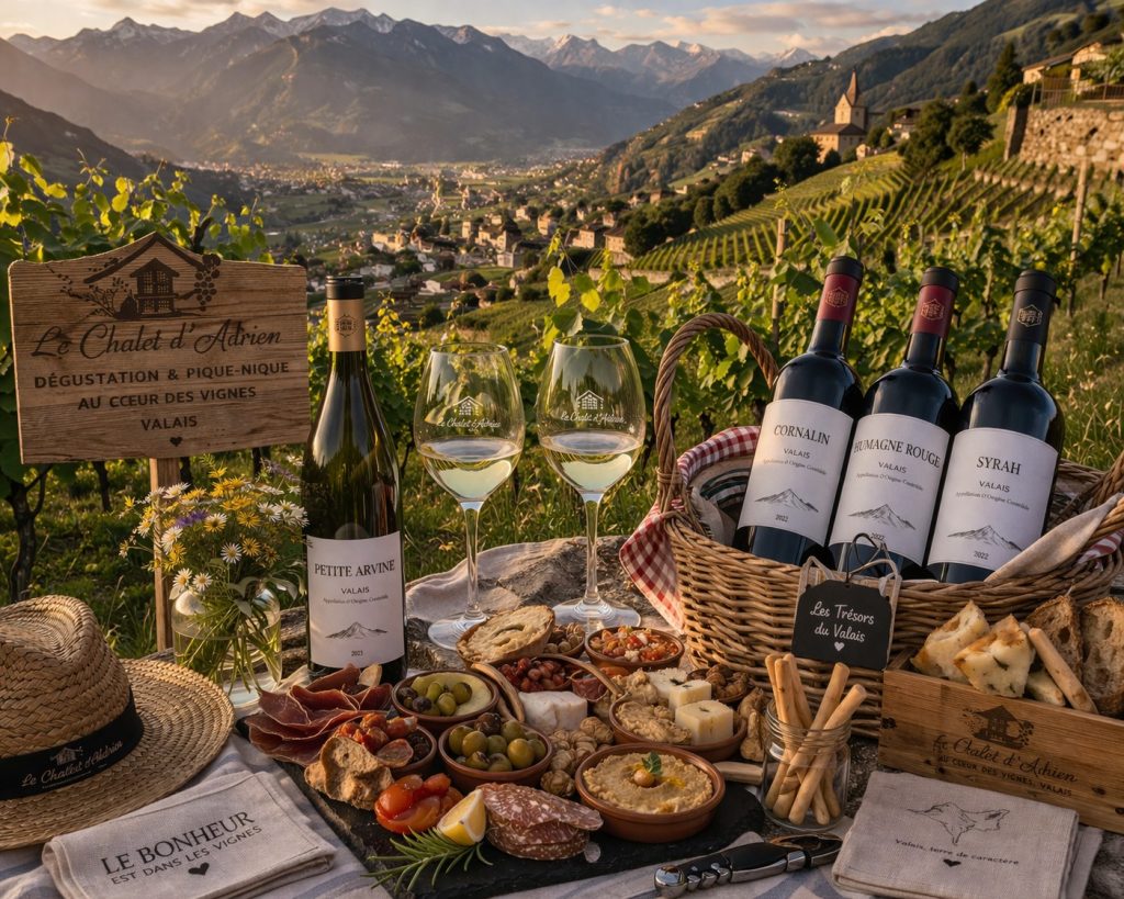 Dégustations de vin et pique nique chez les vignerons du Valais en suivant le chemin du vignoble à pied, à vélo ou en voiture.
